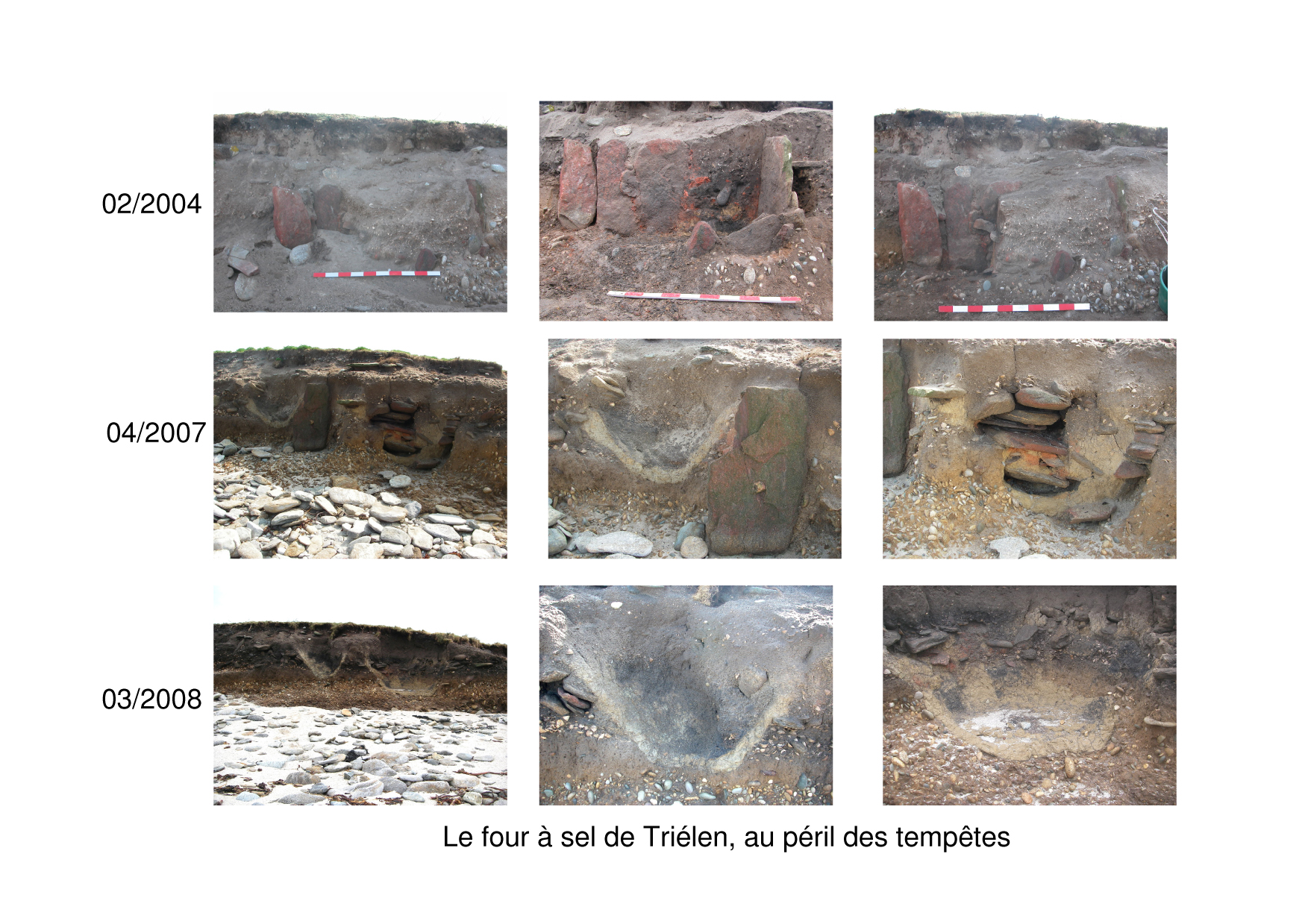Dans la continuité des recherches archéologiques engagées par Yvan Pailler et son équipe dans l’archipel de Molène depuis la fin des années 1990, un suivi archéologique particulier est assuré depuis plus de 10 ans sur l’un des sites de l’île Triélen. Ce site, particulièrement exposé montre une dégradation continue accélérée lors des épisodes de tempêtes, avec un recul de la micro-falaise évaluée entre 0,5 et 1 mètre par an sur cette portion de côte. Ce site, qui correspond à un établissement ‘gaulois’ (habitat et ancien atelier artisanal de production de sel), occupé au cours du second l’Âge du Fer (entre 450 et 50 av. J.-C.).